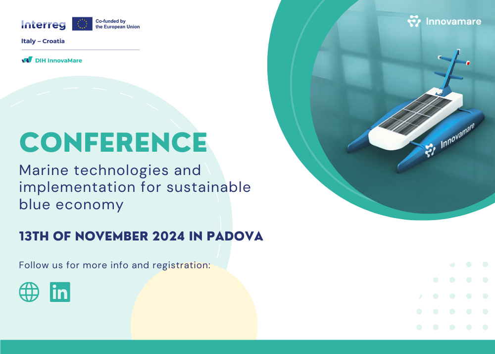 Register now for the Conference: “Marine technologies and implementation for a sustainable blue economy” Published on: Oct 01 2024 Date: November 13, 2024 Venue: Sala Rossini, First Floor of Caffè Pedrocchi, Via VIII Febbraio 15, 35122 Padova, Italy Organizers: DIH Innovamare Project – Croatian Chamber of Economy (CCE), Unioncamere del Veneto (UCV), University of Padova Supported by: DIH Innovamare, European Commission, Ocean Autonomy Cluster and Aegean University About the Conference: Join us at the historic Sala Rossini at Caffè Pedrocchi, University of Padova, for an engaging conference focused on “Marine technologies and their implementation for a sustainable blue economy”. The event will bring together key stakeholders, including spin-offs, companies, students, and researchers, to explore the latest advancements in marine technologies and their implementation. This conference offers a valuable opportunity to engage with thought leaders, explore emerging technologies, and network with stakeholders from Italy, Croatia, Norway, Portugal and Greece passionate about advancing the blue economy and highlight the potential for digital and green transformations within the blue economy, encouraging students and researchers to explore new research topics or study programs: Showcasing innovations: learn about the transformative potential of digital and green technologies in the blue economy, with insights from leading figures and successful projects. Encouraging new research and study: discover new research topics and study programs that can inspire students and researchers to contribute to the sustainable development of the blue economy. Dissemination of key results: receive updates on the latest map of excellence, designed to foster connections and collaborations among students, companies, and researchers within the university community. Registration information: Participation: free of charge Registration period: open now until all spaces are filled, latest October 31st To secure your spot, please complete the registration form below. For the conference agenda click here. Logistic information: For detailed information on how to reach the venue, nearby parking, and public transport options, please refer to the logistic information available here. Don’t miss the chance to be part of this international event in marine technology and sustainable blue economy development. We look forward to welcoming you to the University of Padova on November 13, 2024! Organised by: Supported by: